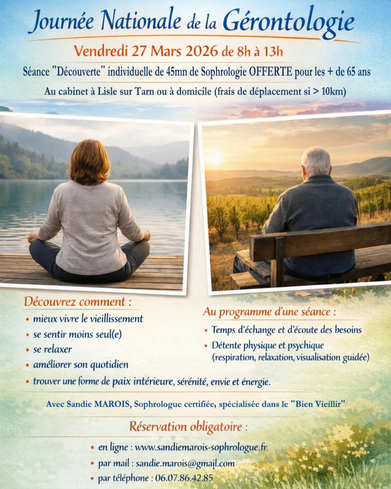 A l'occasion de la Journée Nationale de la Gérontologie, Vendredi 27 Mars 2026, bénéficiez gratuitement d'une séance individuelle de 45mn pour...